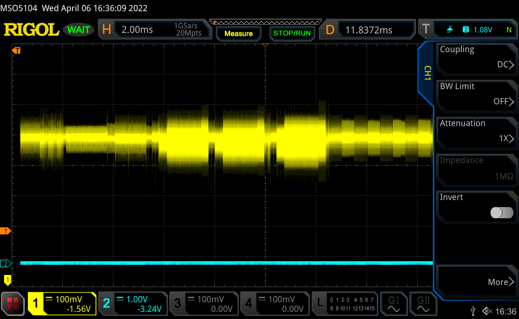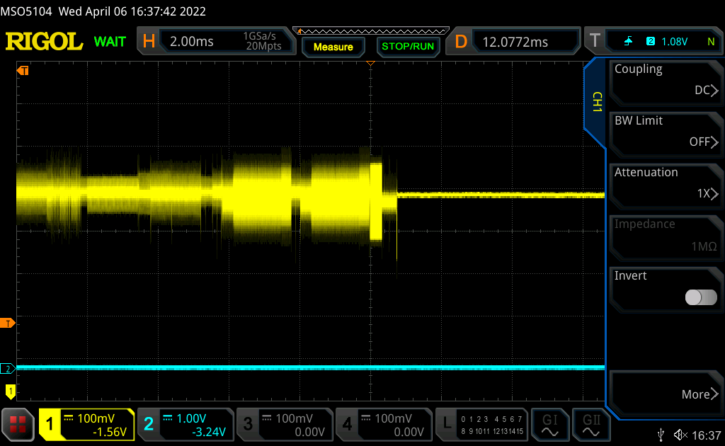 To obtain the attack window for the fault injection attack, power trace analysis is required. The following image shows the power trace of the device loading a Qualcomm-signed binary.