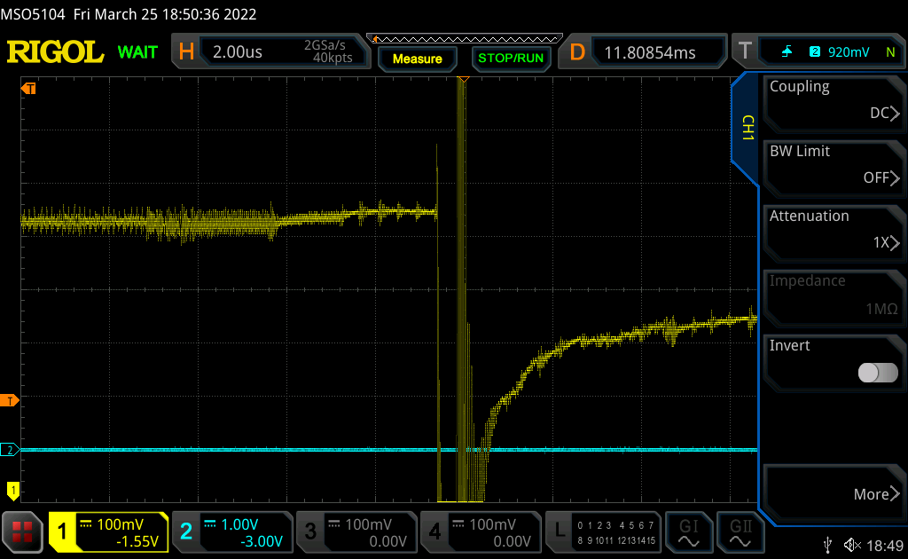 Similarly, the following image shows the power trace of the device loading a binary whose Root Certificate’s signature has been modified. This does not affect subsequent verifications but changes its SHA-256 checksum, making Root Key Hash validation fail.