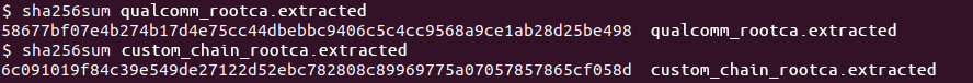 The Root Certificate of the binary’s Certificate Chain is the one provided by Qualcomm. The binary is verified and loaded.